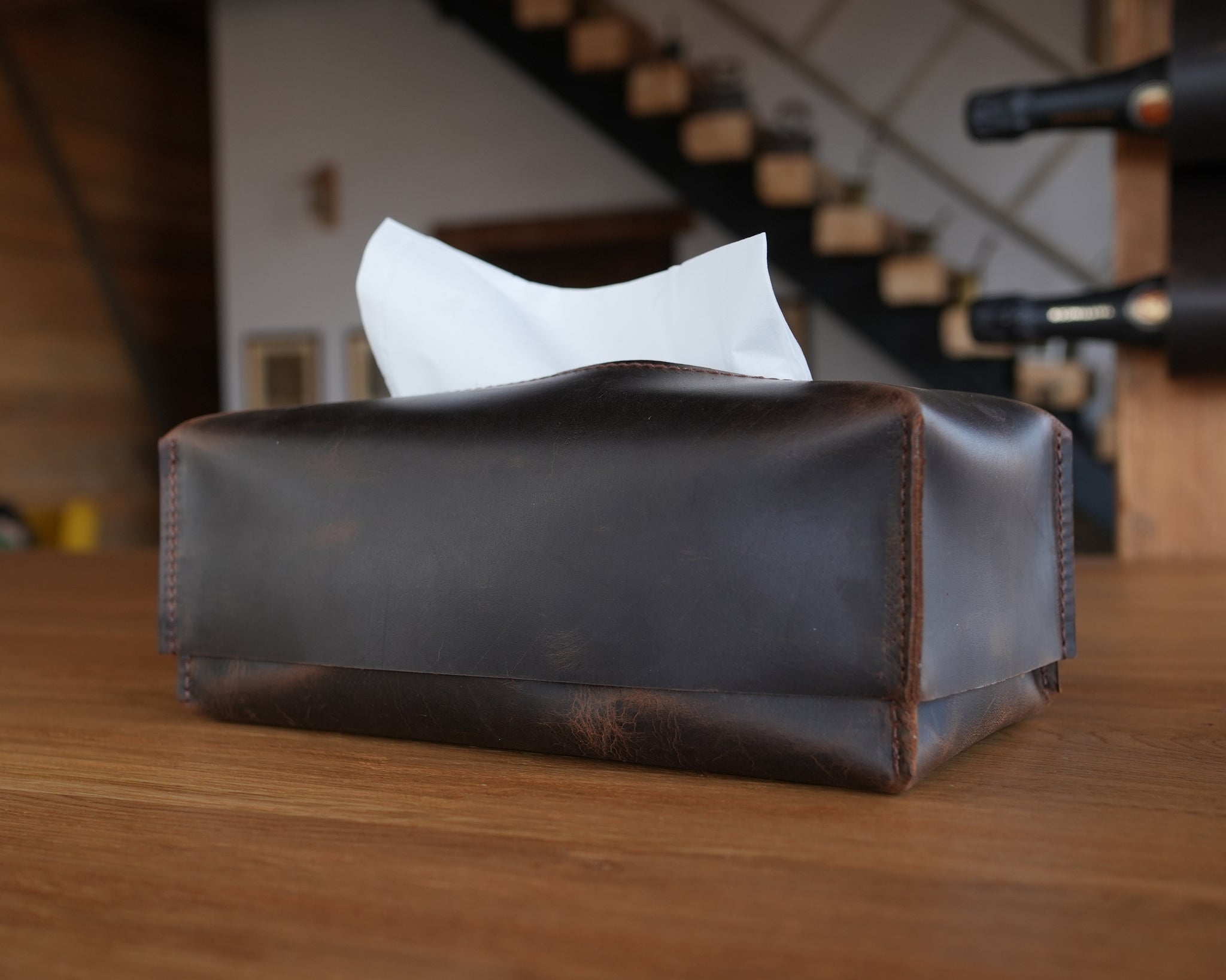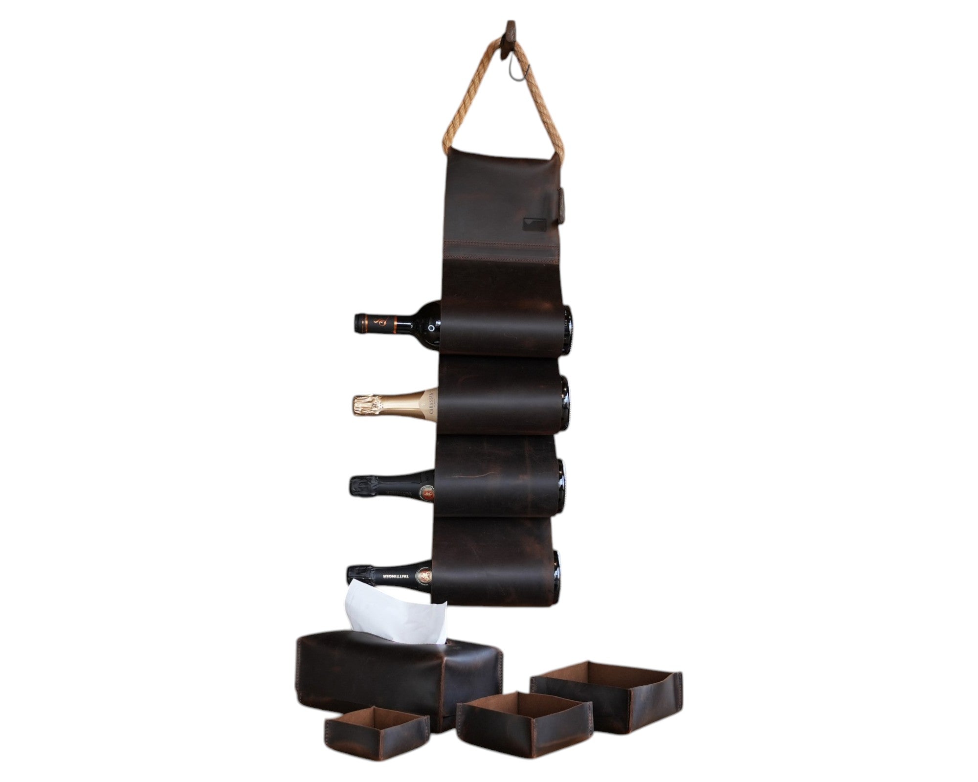 Acest suport din piele pentru sticle de vin, realizat manual, este completarea perfectă pentru decorul barului de acasă. Fabricat din piele de calitate premium, provenită din surse etice, oferă o soluție rustică, dar elegantă pentru depozitarea vinului.